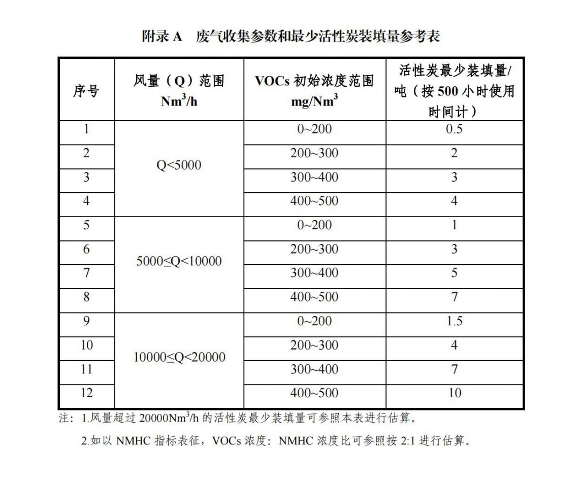 VOCs廢氣收集參數(shù)和最少活性炭裝填量參考